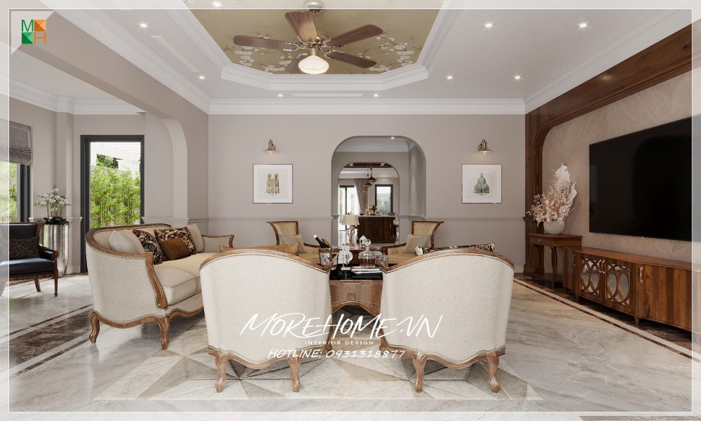 Nội thất góp nên một phong cách phòng khách tân cổ điển chính là bộ sofa bọc da gỗ óc chó cao cấp với đường nét uốn cong mềm mại của viền gỗ tự nhiên cao cấp.