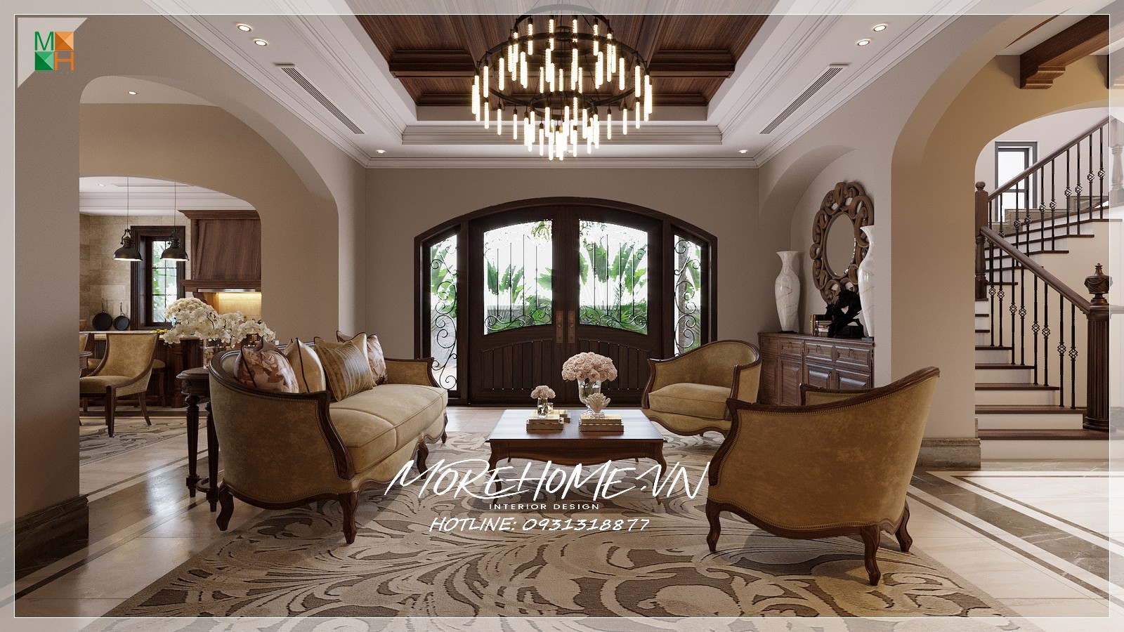 Sản xuất sofa Tân cổ điển MS-033 khung gỗ tự nhiên Óc chó với các họa tiết chạm trổ bằng tay cầu kỳ, tỉ mỉ, bọc nỉ cao cấp nhập khẩu sang trọng cho phòng khách tại chung cư Vinhomes Gardenia, Hà Nội.