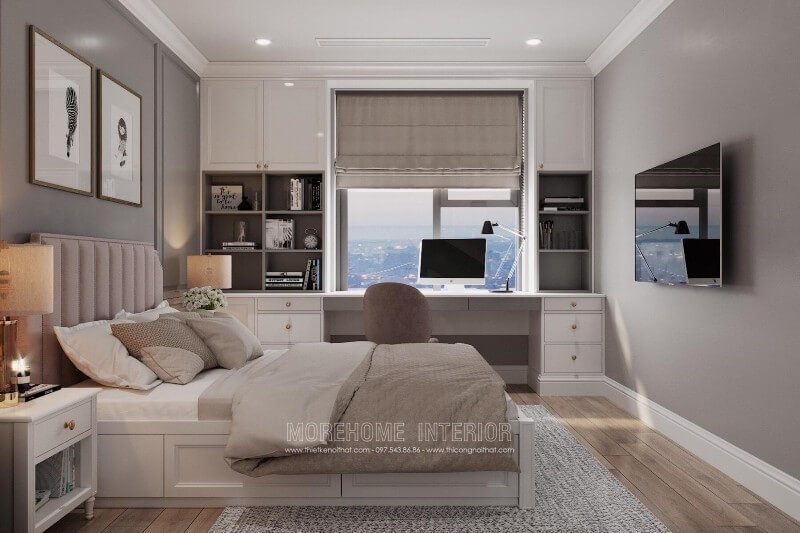 Trang trí phòng ngủ chung cư hiện đại, bàn làm việc được bố trí ngay cạnh cửa sổ giúp bạn có thể nghỉ ngơi và làm việc tập trung, thuận tiện nhất
