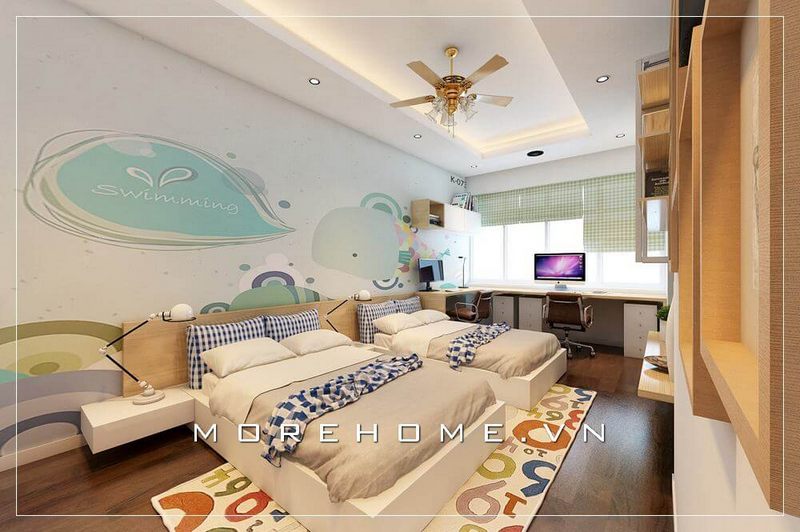 Toàn bộ nội thất phòng ngủ bé trai được làm từ gỗ công nghiệp an cường, gam màu nhẹ nhàng tạo cảm giác ấm áp và gần gũi hơn