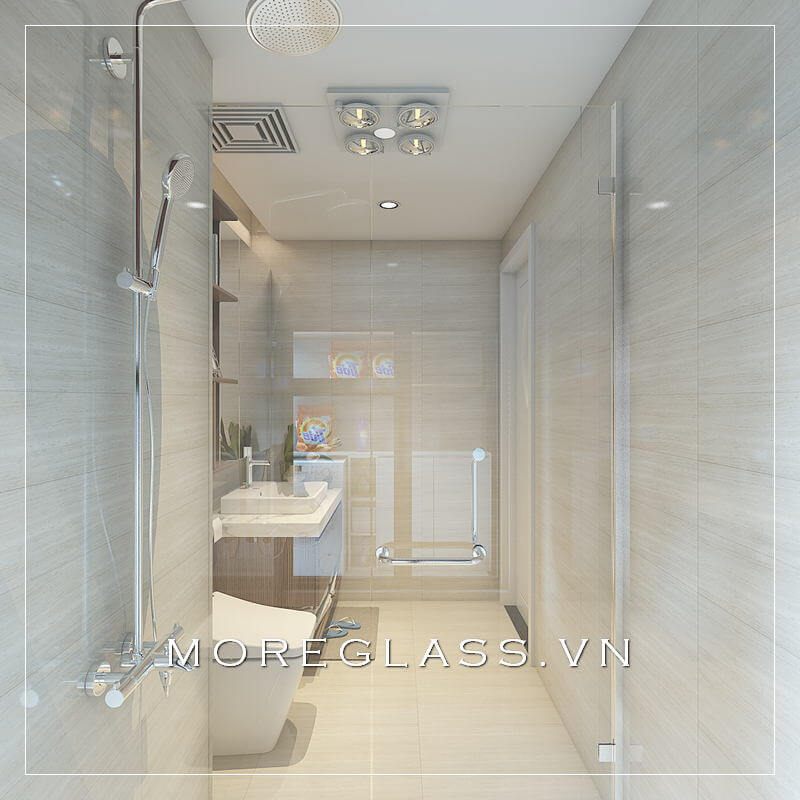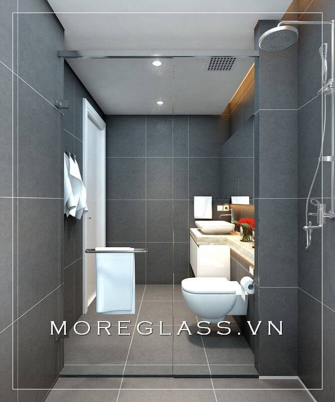 Với không gian phòng tắm hạn chế thường có bố cục chung: từ cửa vào là tủ kê để đồ, lavabo, bồn vệ sinh và cuối cùng là phòng tắm kính ở cùng.