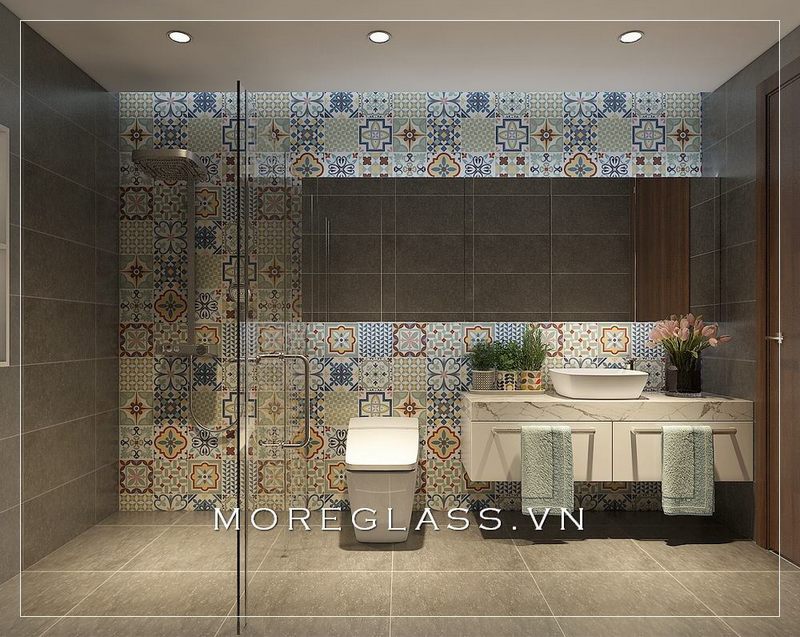 Mẫu thiết kế phòng tắm hiện đại với thiết bị vệ sinh đơn giản, tinh tế nổi bật với bức tường gạch men họa tiết độc áo.