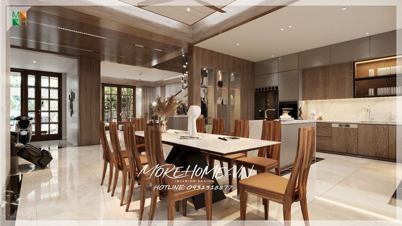 Mẫu tủ bếp gỗ công nghiệp hiện đại, tiện nghi cho phòng ăn biệt thự