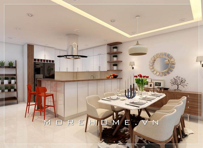 Thiết kế nội thất phòng ăn chung cư liền kề phòng bếp tạo sự thuận tiện hơn trong quá trình dùng bữa cũng như tiếp đãi khách tới chơi nhà của bạn những bữa cơm ngon miệng