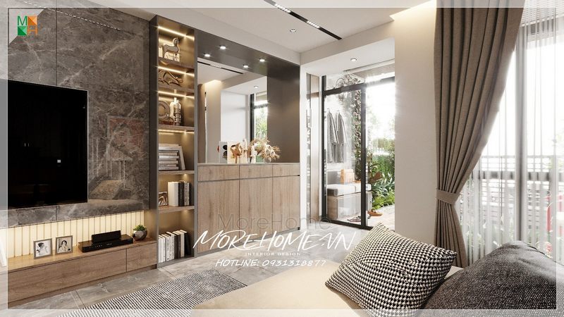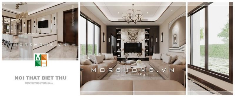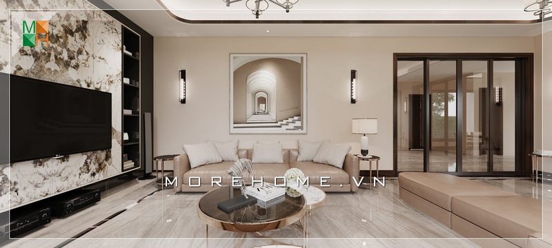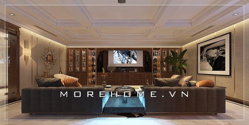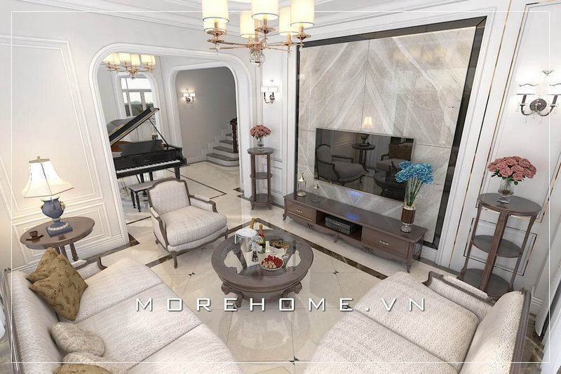 Phòng khách nhà phố, biệt thự được thi công bởi nội thất Morehome gỗ óc chó phong cách tân cổ điển mang tới cho không gian cao cấp, tiện nghi và thẩm mỹ