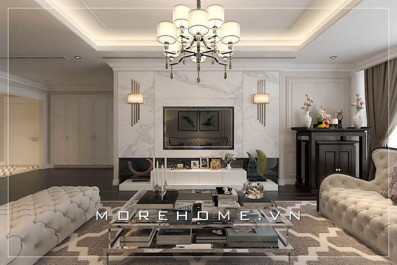 Thi công nội thất phòng khách ấn tượng với thiết kế tân cổ điển