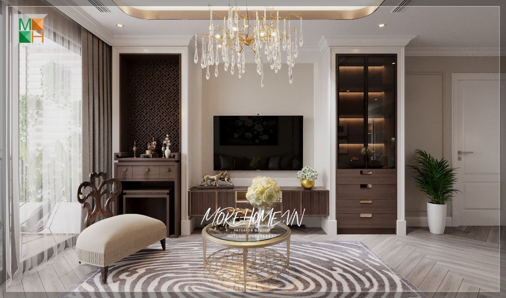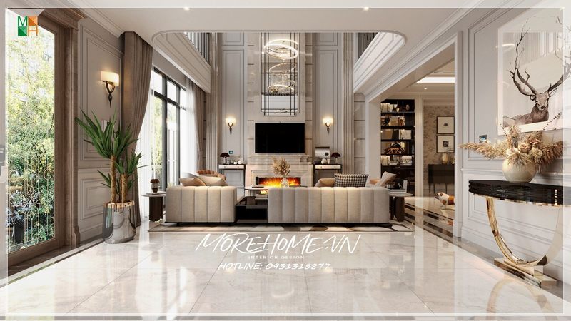 Phòng khách trang trí nội thất với phong cách tân cổ điển không gian sang trọng cao cấp.