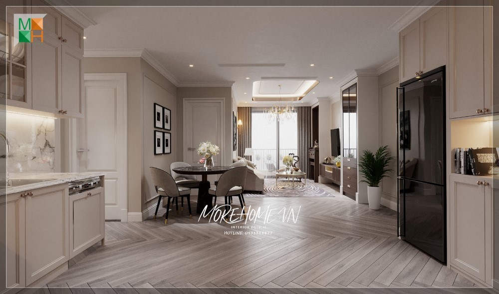 Ấn tượng với cách trang trí nội thất phòng khách khoa học dành cho chung cư, nhà phố, biệt thự. Thiết kế mở kết hợp giữa phòng bếp liền phòng ăn. Điều này tạo ra sự gắn kết và dễ dàng di chuyển trong quá trình phục vụ nhu cầu sinh hoạt hàng ngày của gia chủ.