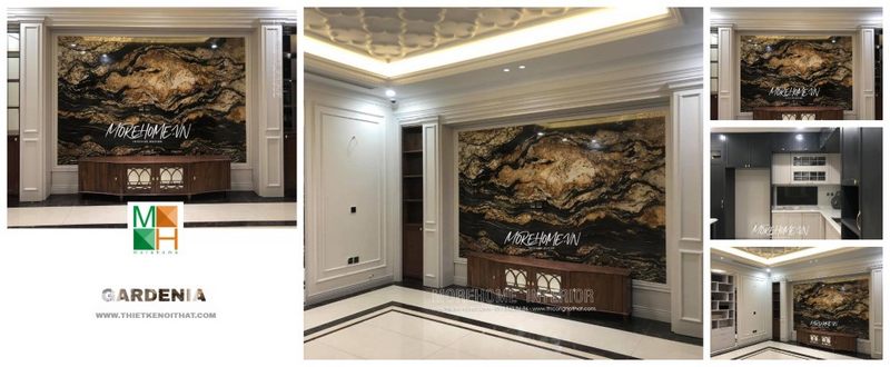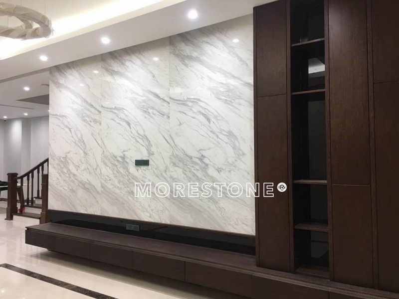 Hình ảnh thi công đá ốp vách tivi phòng khách do Morehome cung cấp lắp đặt
