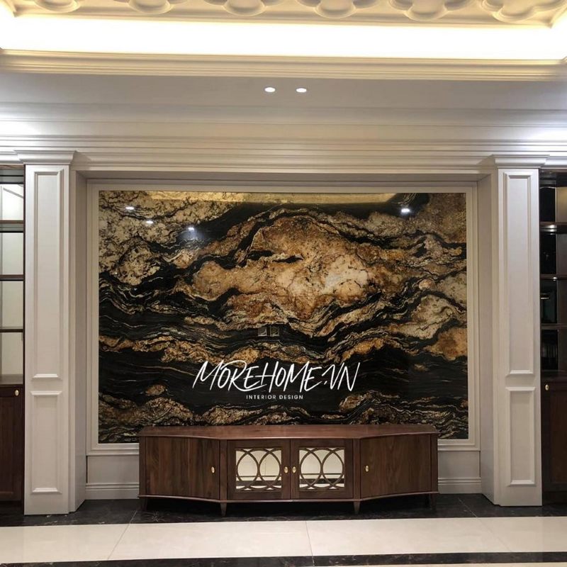Thiết kế vách tivi bằng đá đối vân cao cấp mang đến điểm nhấn nổi bật, ấn tượng cho không gian phòng khách