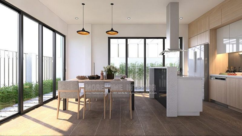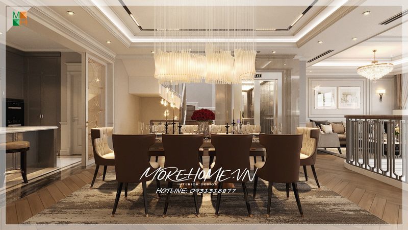 Thiết kế phòng bếp liền phòng ăn theo phong cách tân cổ điển đầy nghệ thuật nhưng được tối giản nhiều chi tiết nên vẫn thoáng đãng và gần gũi