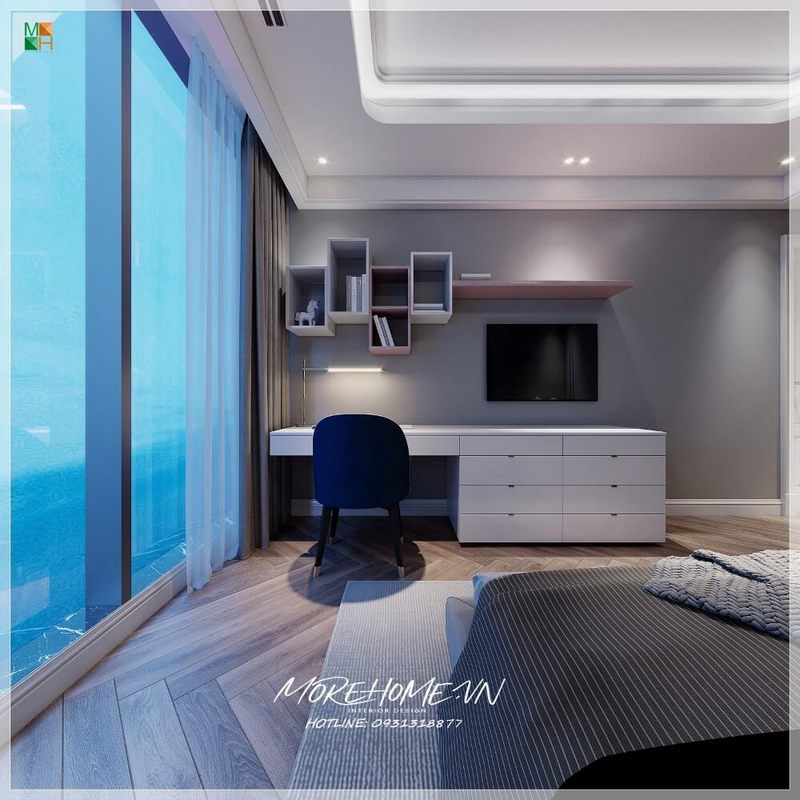Phòng ngủ chung cư nội thất thiết kế có bàn làm việc không gian tiện nghi sử dụng thoải mái hõ trợ tốt cho sử dụng của gia chủ.